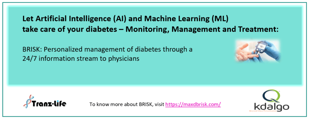 Tranz-Life partners Kdalgo™, a data science solutions firm that builds analytics and machine learning systems, to introduce BRISK™ [Blood Sugar Risk Analytics And Machine Learning]: an app that harnesses the power of analytics and machine learning to provide insight into the trend, prediction and prognosis of all major health metrics related to elevated blood sugar. Based on the patient’s inputted diet, exercise and medication information, the app offers personalized insights that help both patients and physicians make the best decisions for diabetes management.